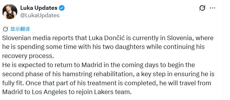 在斯洛文尼亚短暂停留后,东契奇将很快返回马德里进行下一阶段治疗。此后,他将从西班牙首都飞往洛杉矶,在那里与湖人队汇合。