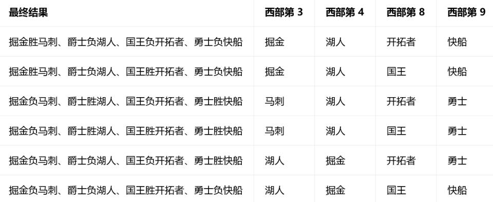 以下是西部所有比赛结果及其对应的排名情况——