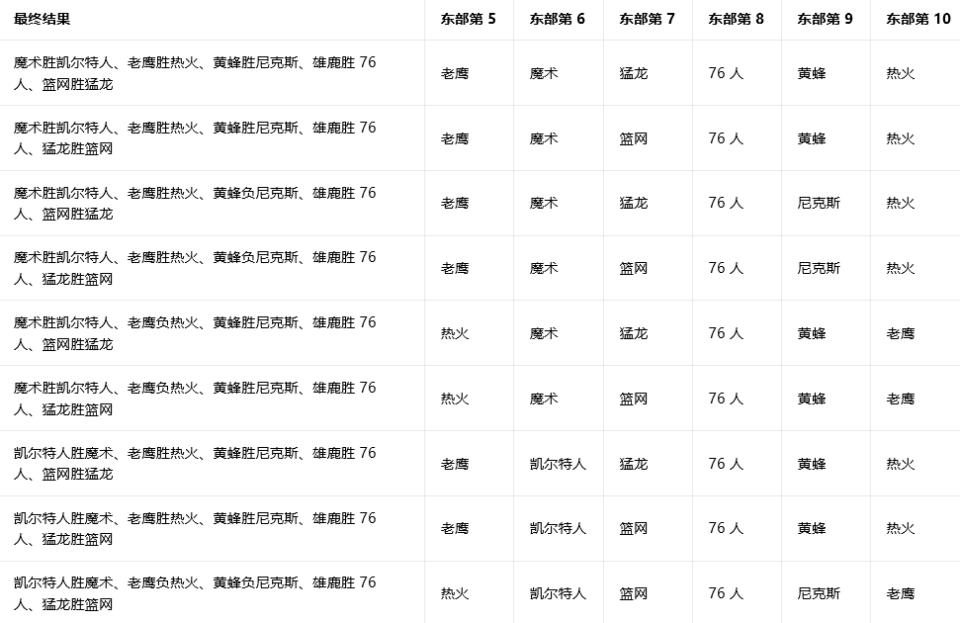 以下是东部所有比赛结果及其对应的排名情况——