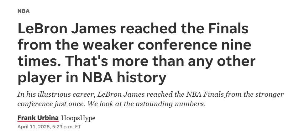 4月12日,知名美国媒体HoopsHype从统计视角剖析了詹姆斯十次打进总决赛的非凡经历,并强调他有九次是从竞争力较弱的分区突围进入总决赛,该次数在NBA史上排名第一。以下是媒体的详细分析——