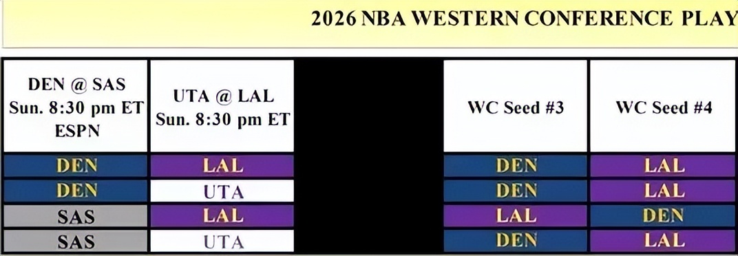 具体安排是:若掘金战胜马刺,则锁定西部第三,首轮对阵森林狼;即使掘金输给马刺,还需看湖人表现——如果湖人收官战击败爵士,将升至西部第三并在首轮迎战森林狼,掘金便可如愿对阵火箭;反之,若湖人输掉收官战,则他们首轮对阵火箭,同时让掘金去打森林狼。