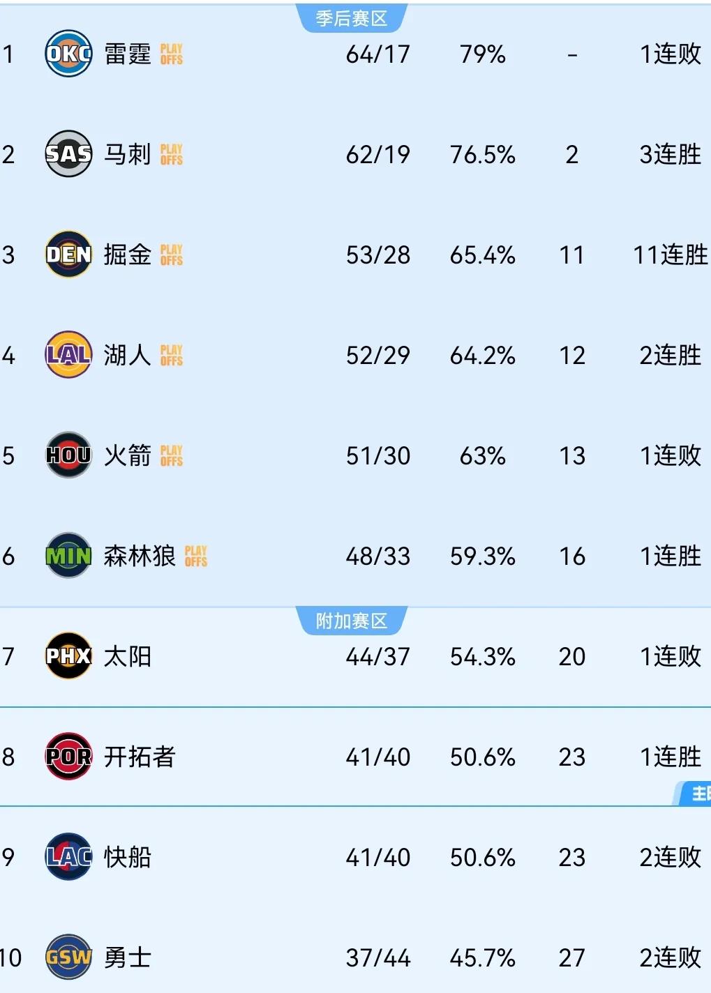 掘金目前战绩53胜28负排在西部第三,湖人52胜29负第四,火箭51胜30负第五,森林狼48胜33负第六。