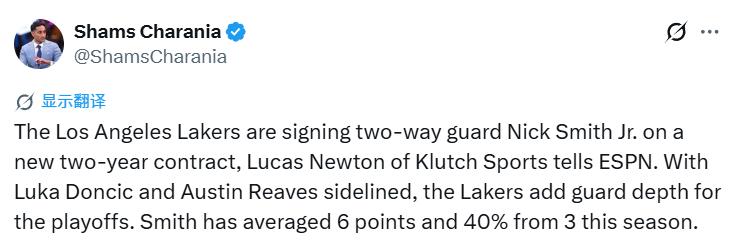 4月12日北京时间,知名记者Shams透露,洛杉矶湖人队计划与双向后卫小尼克-史密斯签署一份为期两年的新合约。鉴于东契奇与里夫斯缺席,湖人此举旨在增强季后赛后卫阵容厚度。这也意味着他顶替了先前裁减巴夫金所空缺的位置,成为湖人季后赛名单中的第15位成员。