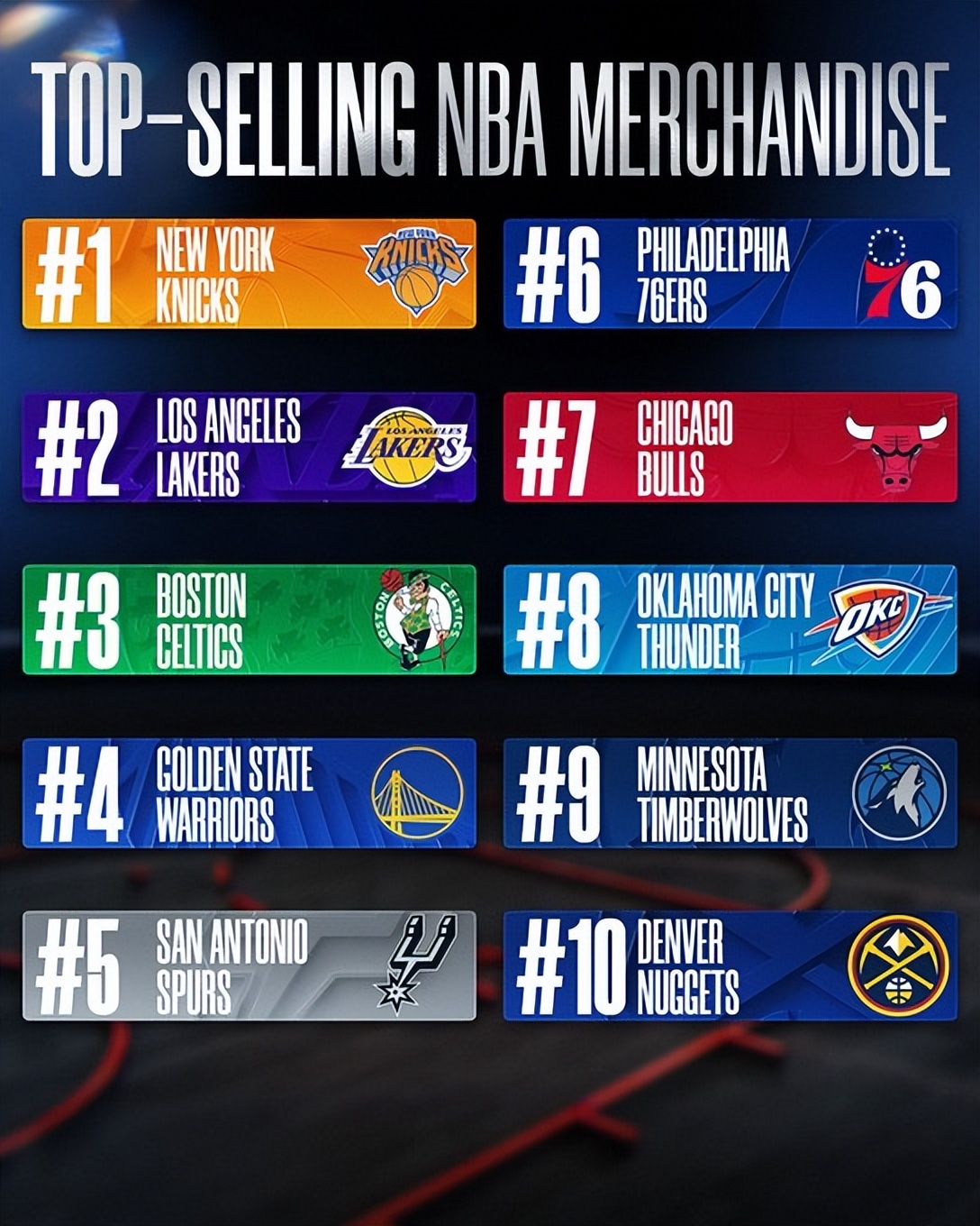 俄克拉荷马城雷霆队(球队周边销售第八名)自2018-2019赛季以来,本赛季首次进入球队周边商品销售前十行列。