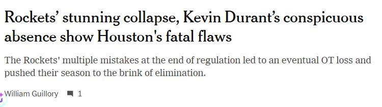 北京时间4月25日,火箭队记者William Guillory报道了球队在输掉第三场比赛后的具体情况,其中包括乌度卡在更衣室的训话,以及杜兰特全程缺席所引起的热议。以下是详细内容——
