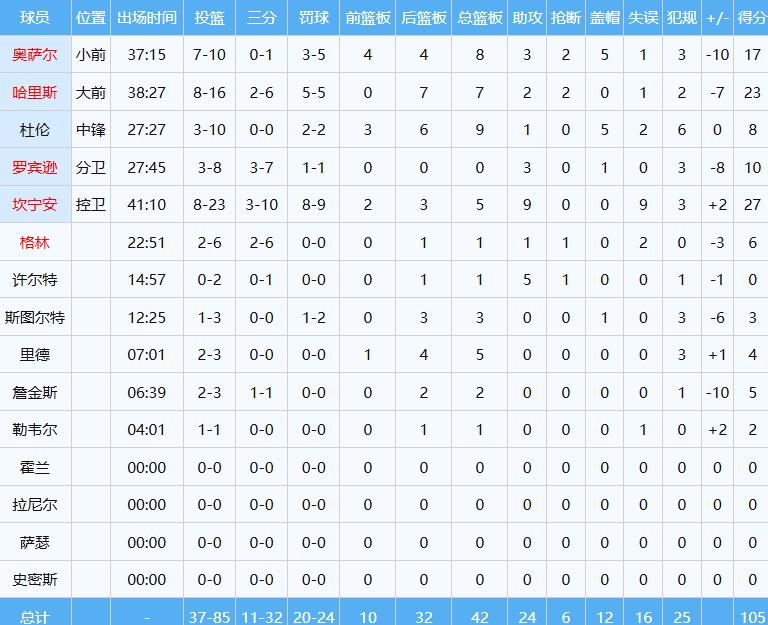21届状元坎宁安23投8中,得到27分5篮板9助攻,同时出现9次失误;内线核心杜伦10投3中,仅取得8分9篮板的准两双,唯一亮点是5次盖帽数据。