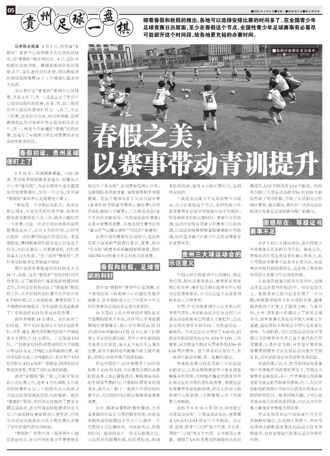 3月31日,据权威媒体报道,山东、湖南、贵州等地陆续下发通知,筹划设立中小学春秋假期。正当家长与学生思索假期安排时,仅隔一日,贵州省“春假杯”青训中心足球赛就已拉开帷幕。