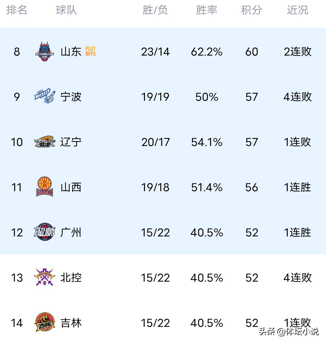 北京时间4月13日,CBA常规赛继续进行,昨晚结束的三场比赛中,青岛队以78-77险胜本赛季进步迅速的宁波队,北京队以83-88惜败于领头羊上海队,而在强强对话中,广厦队以85-91不敌广东队。至此,最新积分榜出炉:上海队凭借19连胜高居榜首,广厦队位列第二,广东队以3连胜重返第三位,北京队4连胜终结后排名第四,青岛队攀升至第六位!