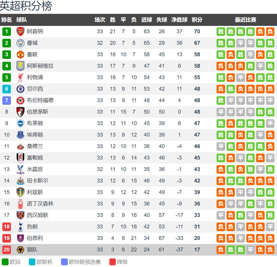 英超33轮结束后,狼队取得3胜8平22负,积17分位居倒数第一,与第17名西汉姆联相差16分。英超赛季共38轮,剩余5轮赛事中,狼队已提前五轮确定降级。