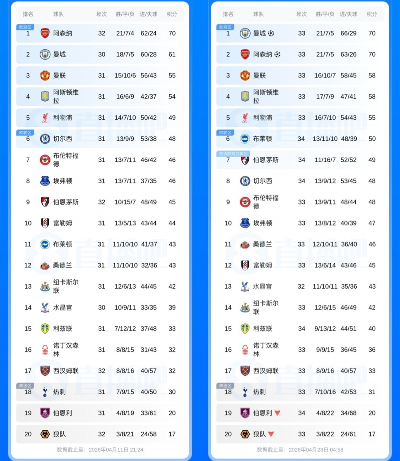 4月23日凌晨,位于降级区的伯恩利主场迎战曼城。此战哈兰德在五分钟内破门得分,之后还有射门打中门柱。曼城最终客场1比0小胜伯恩利。曼城积分与阿森纳持平,因积分相同、净胜球相同但进球数多三个而暂时反超阿森纳登上榜首;伯恩利则提前四轮降级至英冠,成为本赛季继狼队之后第二支降级的球队。