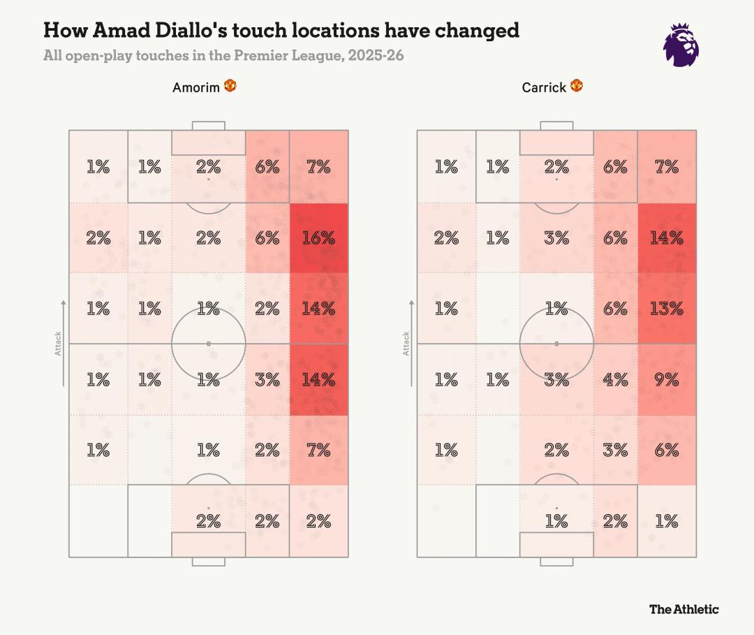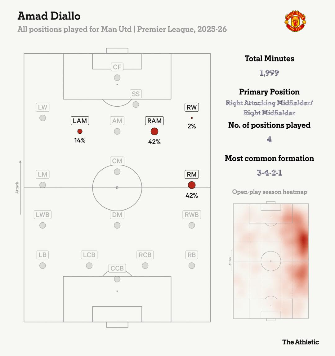 在阿莫林执教期间,阿马德已习惯更多担任边翼卫。卡里克将其位置向前调整,理论上他应贡献更多进球和助攻,但至今尚未实现。