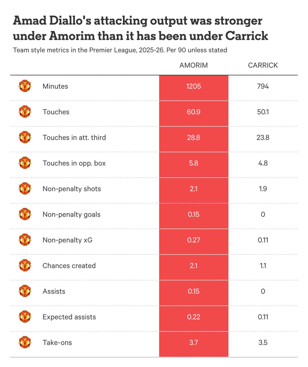 对比阿莫林麾下的阿马德与卡里克麾下的他,从各项标准看,他在前任主帅体系中表现更佳。然而,这或许并不意外。