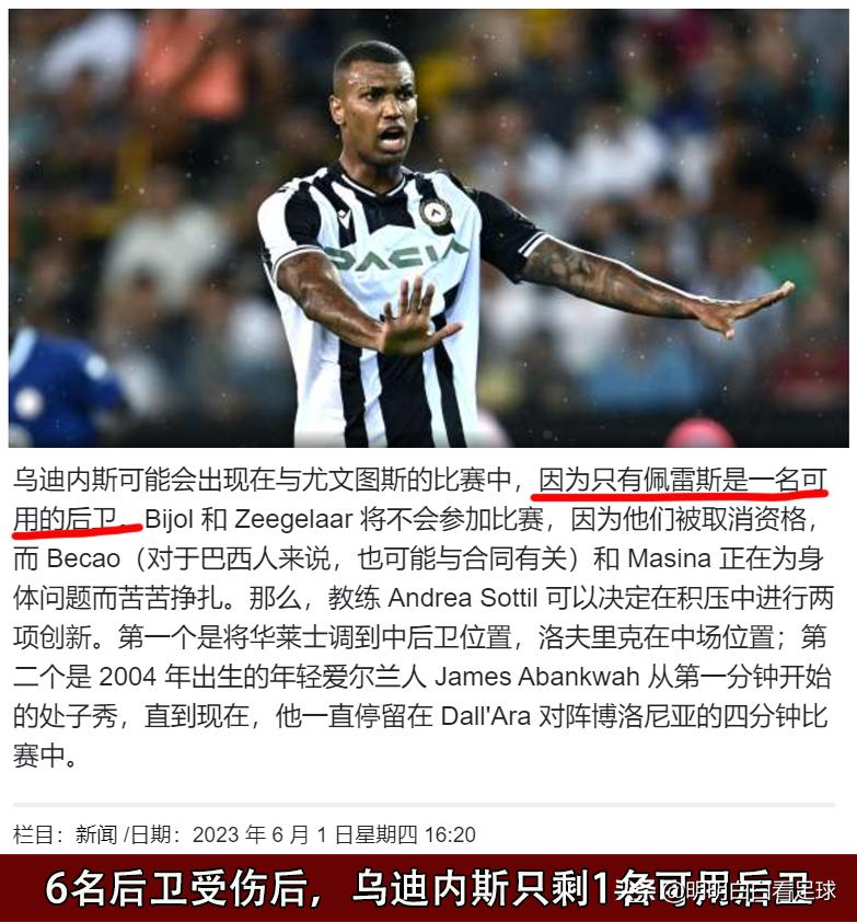 尤文的对手乌迪内斯伤兵满营,仅剩一名后卫,形势也比较不利。