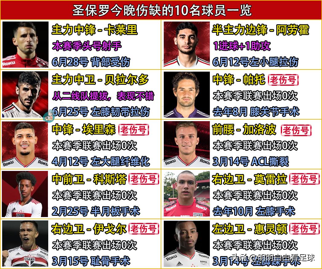 从双方官方伤病名单来看,圣保罗的伤病形势十分严峻,一线队23人中,有10人今天都受了伤。