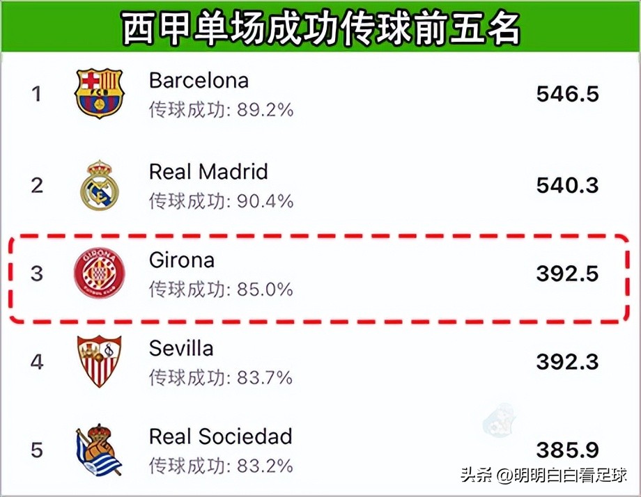 目前他们场均成功传球次数达392.5次,排在西甲第三,甚至超过了塞维利亚和皇家社会这两支传控强队。