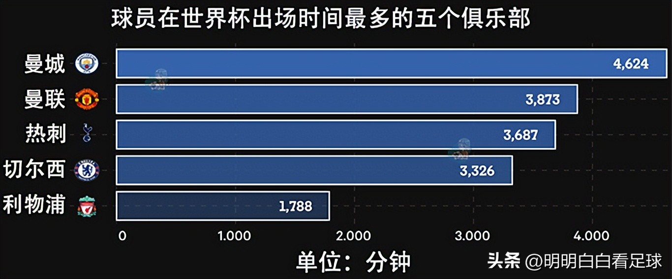 曼城球员在世界杯上的出场总时间达到4624分钟,也是英超最高。