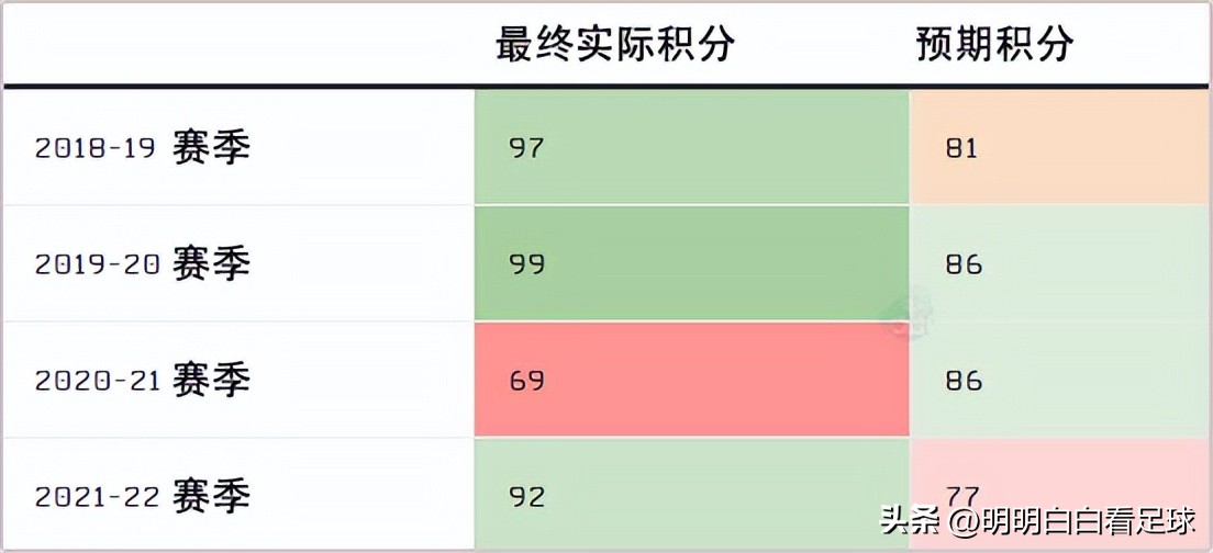 过去四个赛季,利物浦有三个赛季的最终积分超过预期,只有20/21赛季例外。