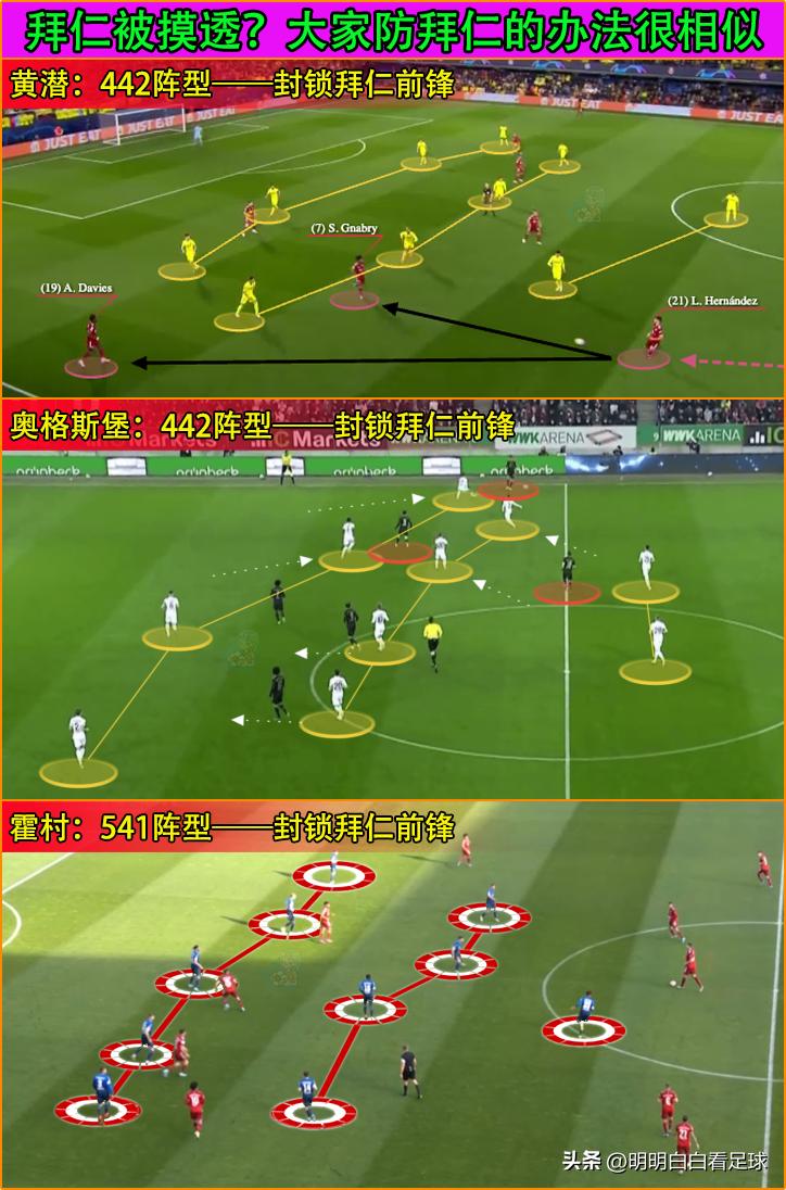比如黄潜或奥格斯堡等德甲队伍,他们用4-4-2或5-4-1阵型对抗拜仁,后卫和中场形成两条防线,切断拜仁中后场与前锋的连接。
