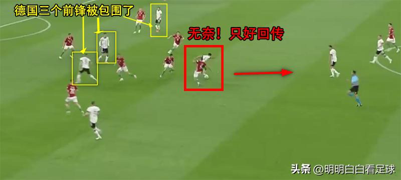 因此我们经常看到德国三名前锋被包围在人群中,难以拿球,中场只能不断回传。