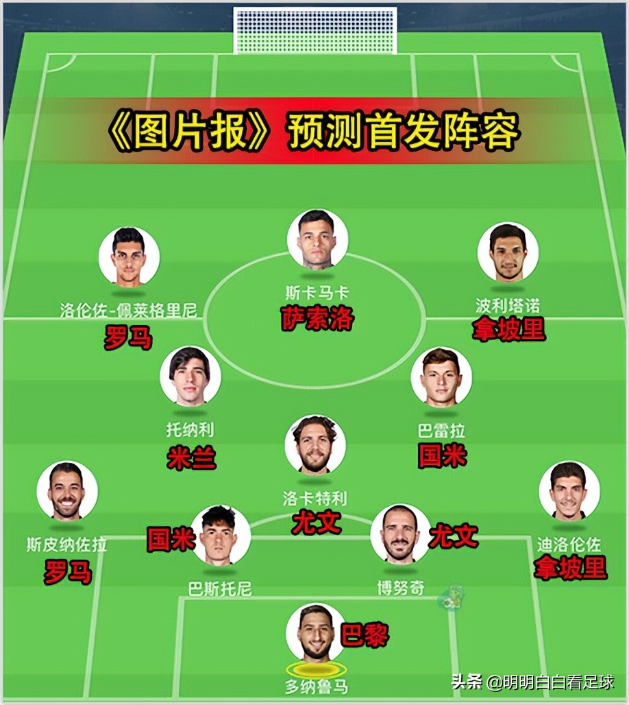 小酒参考了多家预测,《图片报》的预测最为靠谱,他们估计意大利今晚的首发阵容是这样的。