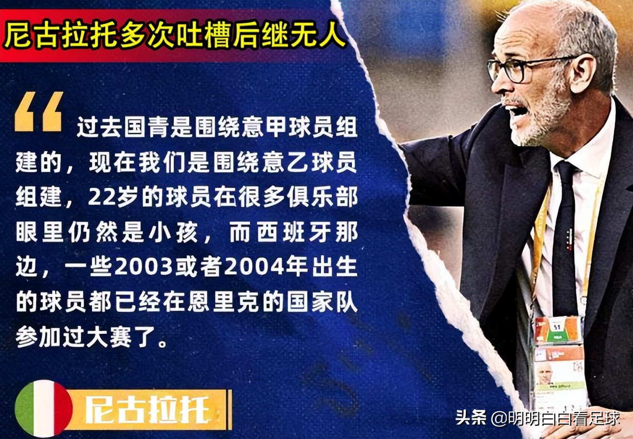 尴尬的是,新一代意大利球员整体水平不高,意大利U21主教练尼古拉托抱怨意甲可用的年轻球员太少,只能从意乙球队选人,U21在欧洲杯外围赛中仅能与黑山战平,甚至可能无法小组出线。