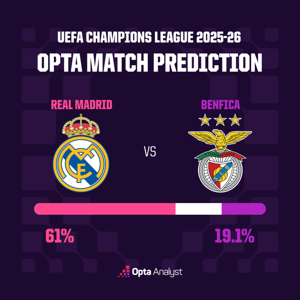 即使主力得分手基利安·姆巴佩临阵缺席,皇家马德里依然被Opta超级计算机看好,拥有明显优势,有望在圣地亚哥伯纳乌击败本菲卡。