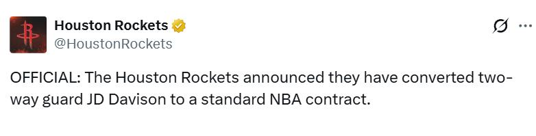 北京时间4月8日,火箭队今日正式公布,已将双向合约后卫JD-戴维森的合约转为标准NBA正式合约。根据先前消息,双方签署的是一份为期两年的合约,第二年包含球队选择权。火箭季后赛15人名单正式确定,杜兰特与申京将带领球队角逐冠军。