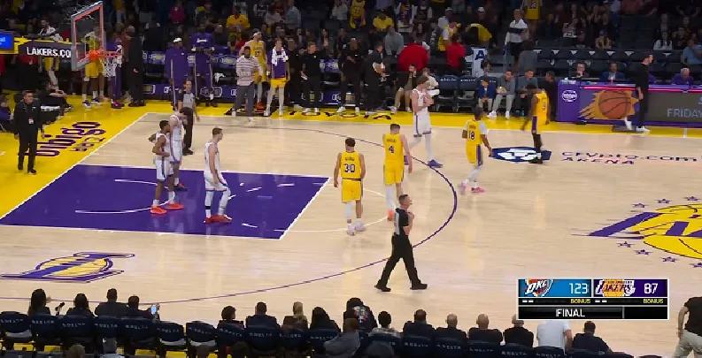 最终雷霆以123-87大胜湖人,净胜36分,且每节比分均占优势。