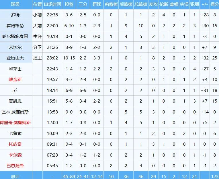 雷霆15名球员悉数登场,每人皆能贡献力量,亚历山大继续延续其单场得分20+的纪录。