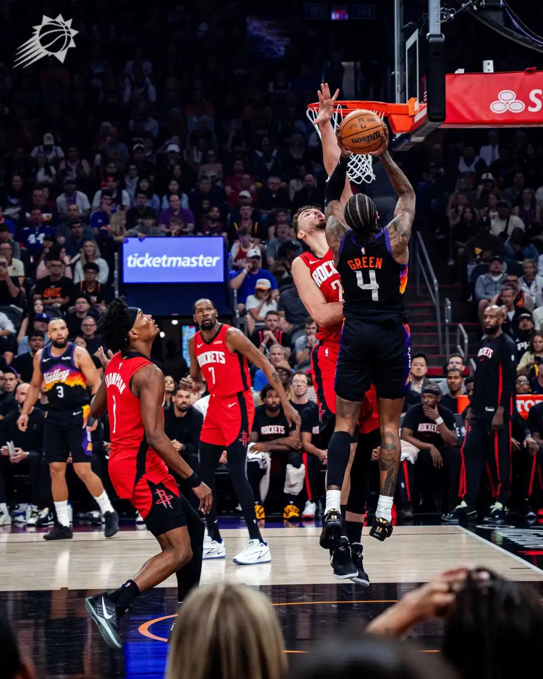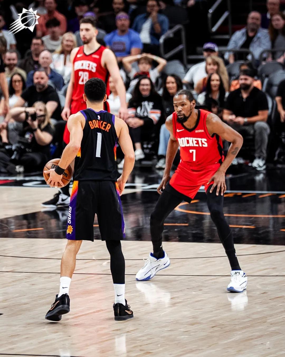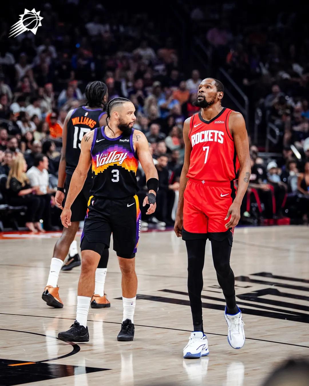 这场太阳对阵火箭的比赛确实趣味十足,虽是赛季第四次碰面,却是首次具备宿敌对决的实质意义。杜兰特虽有过绝杀太阳的表现,但还未在菲尼克斯主场回敬;杰伦-格林此前三次均未出战,今天才首度正式迎战昔日球队。