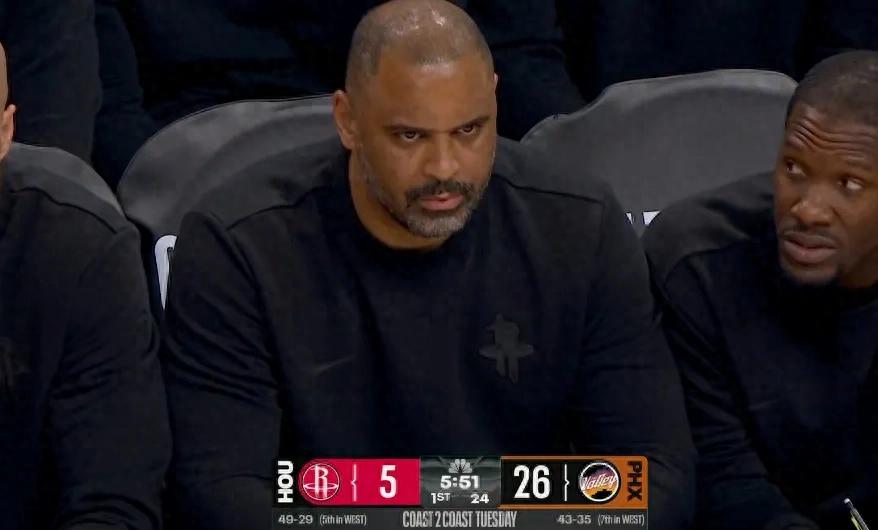 开场火箭便上演惊人一幕,5-2领先后被太阳打出长达24-0的攻势,此为太阳队史最猛烈的进攻浪潮。火箭五分钟内让对手狂砍24分已属震撼,期间自身一分未得更令人咋舌。乌度卡的暂停依旧叫得迟缓,暂停后局面仍未好转。