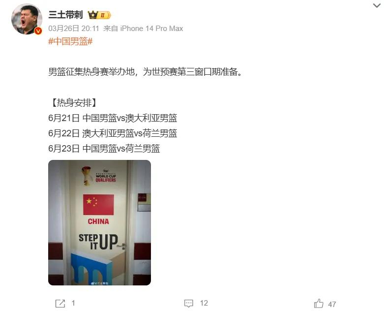 今年7月3日及7月6日的世预赛第三窗口期,中国男篮将再次对阵日本男篮和中国台北队,在此之前还有几场热身赛要进行,对手是澳大利亚男篮与荷兰男篮。