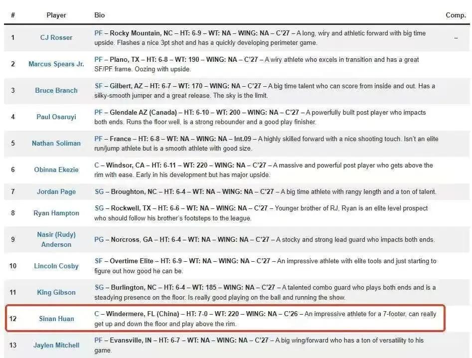 此前美媒NBA Draft Room发布了2028年NBA选秀预测名单,显示郇斯楠为首轮第12顺位。