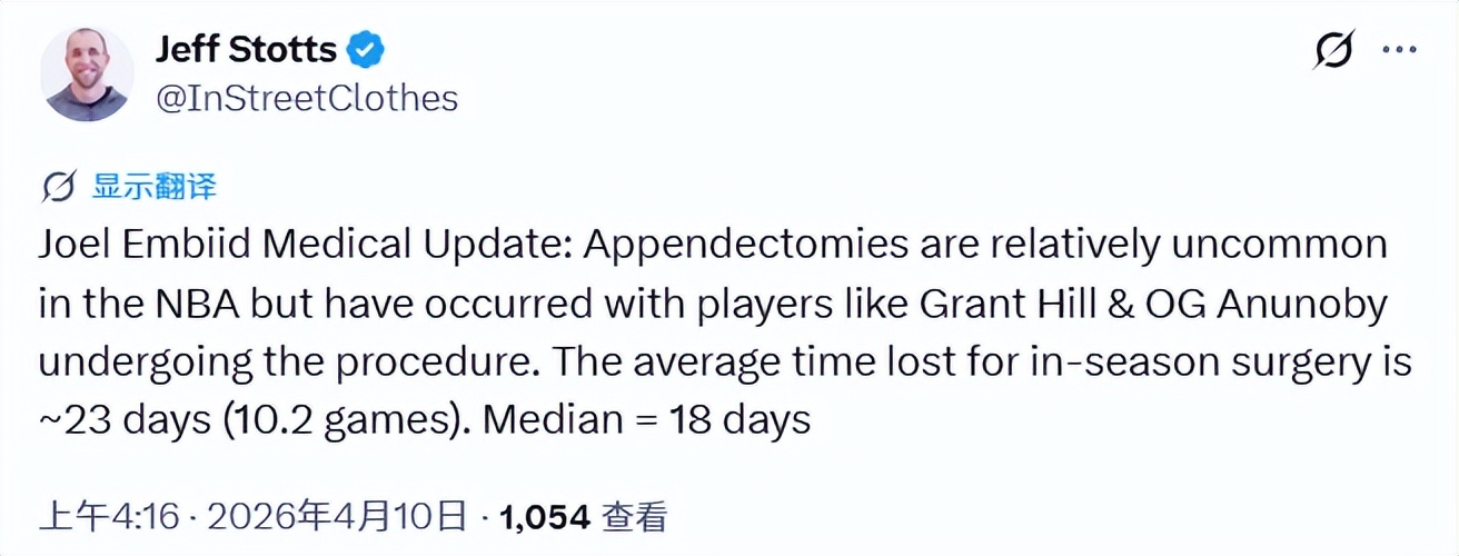 伤病专家斯托茨指出,阑尾切除手术在NBA中较为罕见,但也有球员曾经历,例如格兰特-希尔和OG-阿奴诺比都曾接受该手术。在赛季期间进行此类手术的球员,平均缺席时间约为23天(相当于10.2场比赛),中位缺席时间为18天。