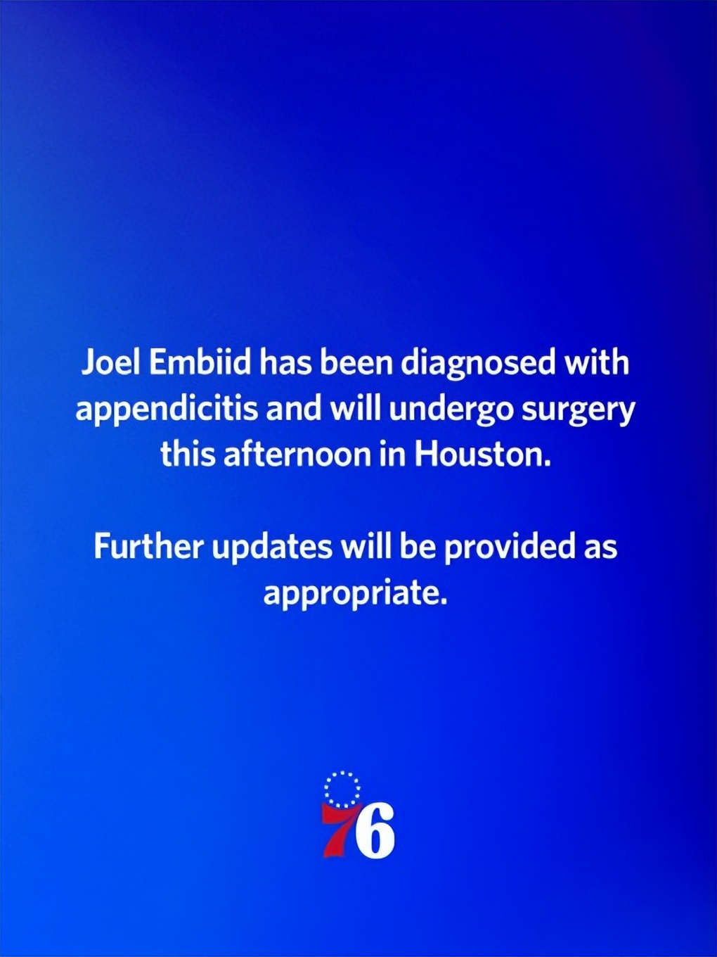 北京时间4月10日,费城76人队明星中锋乔尔-恩比德今日在休斯顿接受了紧急手术。在这场对阵火箭的关键常规赛前夕,他被确诊为急性阑尾炎。