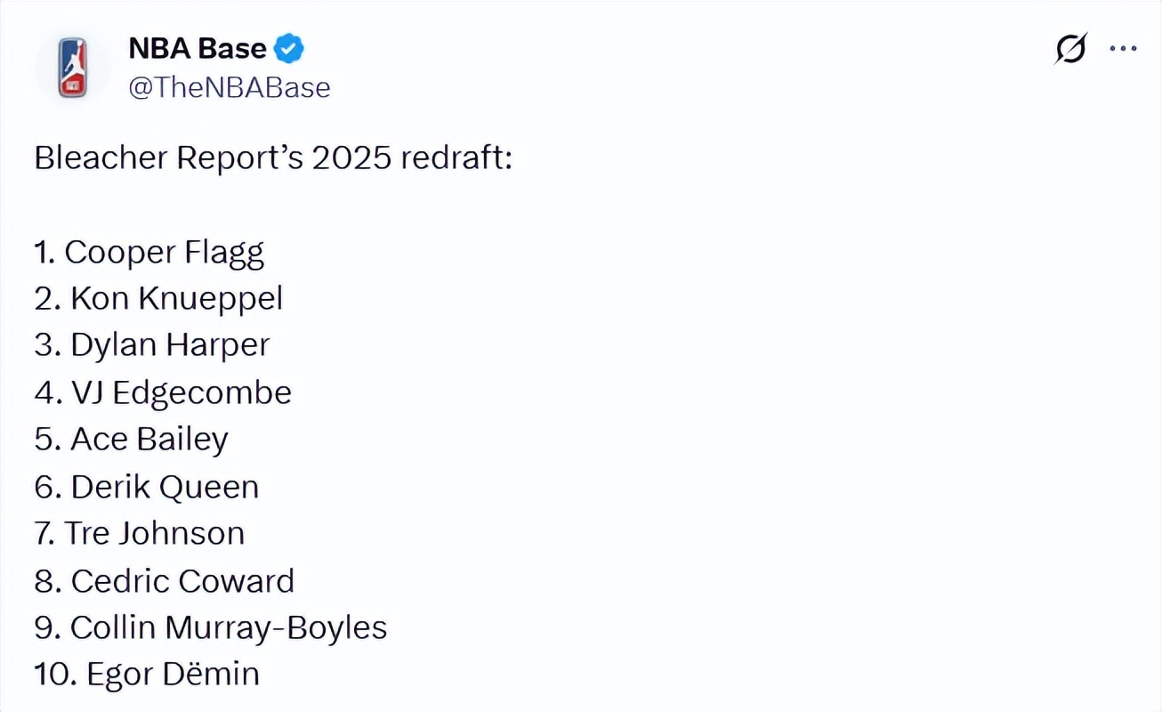 4月10日北京时间,2025-26赛季常规赛接近尾声,著名美国媒体Bleacher Report撰文重新排列2025年选秀顺位。弗拉格保持状元身份,克努佩尔被调整为榜眼,中国球员杨瀚森则跌出首轮名单。以下是重新排列后的前十顺位(括号内为原顺位)——
