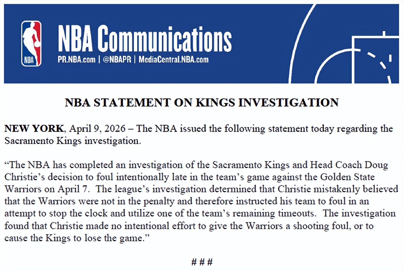 NBA表示,调查结果支持了国王队的说法。联盟声明部分内容如下:调查确认,克里斯蒂错误地认为勇士队尚未进入犯规罚球阶段,因此指示球队犯规,目的是停止计时并使用球队剩余的暂停。调查未发现克里斯蒂有意给予勇士队投篮犯规、或故意让国王队输球的证据。