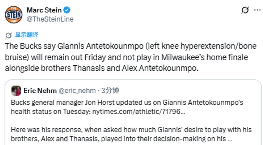 北京时间4月10日,雄鹿官方确认,字母哥(左膝过度伸展/骨挫伤)将继续缺席明日比赛,不会参加雄鹿主场迎战篮网的收官之战,也无法与哥哥萨纳西斯、弟弟亚历克斯一同上场。