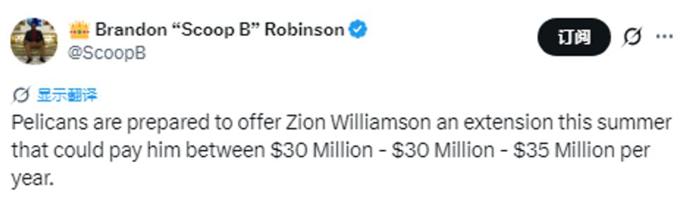 4月10日北京时区消息,NBA记者布兰登·罗宾逊引述鹈鹕内部人士称,球队对锡安·威廉姆森的信任坚定不移。计划在今夏向他提出一份为期2至3年的续约协议,年薪范围在3000万到3500万美元。虽然锡安于2022年签署的五年续约仍在执行中期,但新合约旨在进一步确立其作为球队核心的地位。