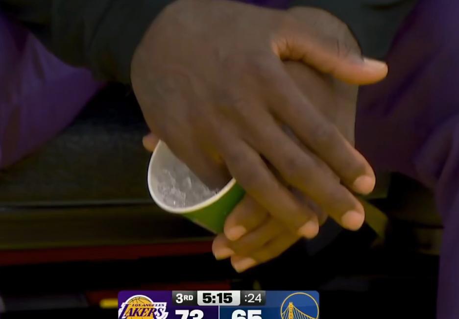 第三节比赛中,詹姆斯飞身追帽,右手小指受伤。随后他返回场边接受冰敷治疗,不久后再度上场。