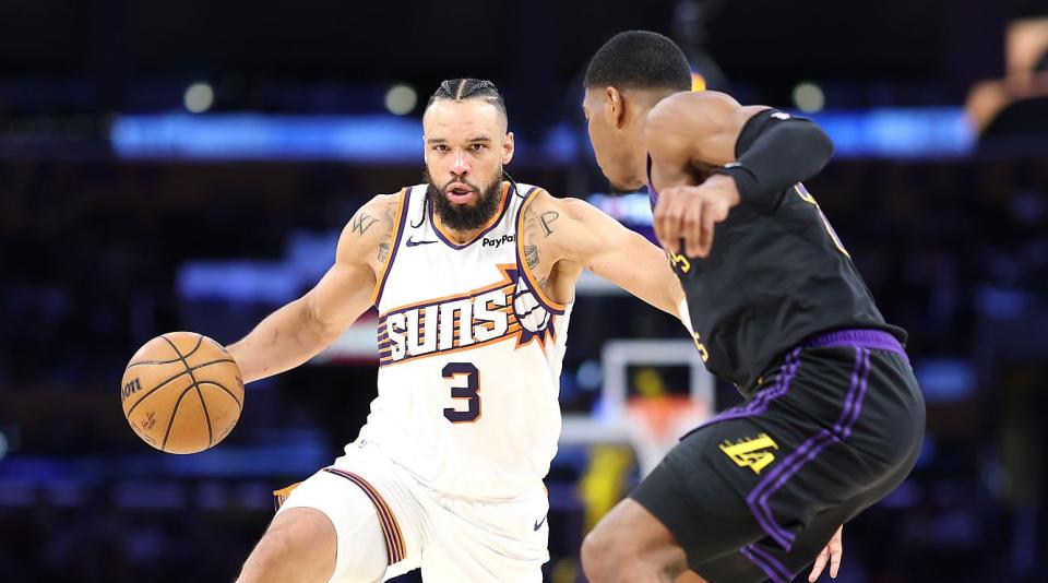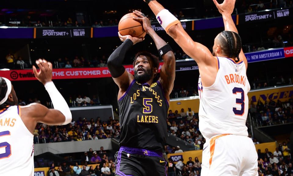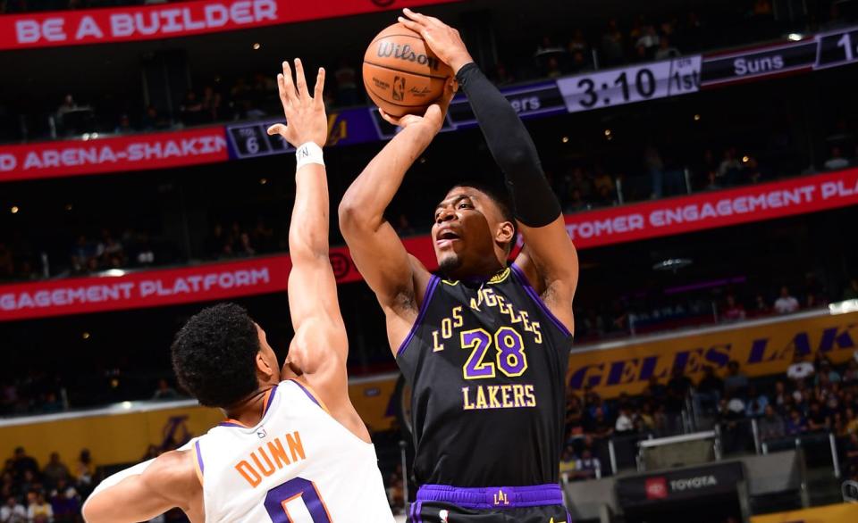 下半场开始,布耶与奥尼尔替换吉莱斯皮和狄龙。布耶上篮得分,艾顿扣篮,八村垒三分命中,肯纳德抛投命中,湖人领先15分。科菲上篮得分,终结太阳超过7分钟的运动战进球荒。湖人命中率也明显下滑,伊戈达罗空接得分。斯马特连得4分,随后助攻范德比尔特扣篮,詹姆斯也连取4分,湖人将分差拉开至19分。