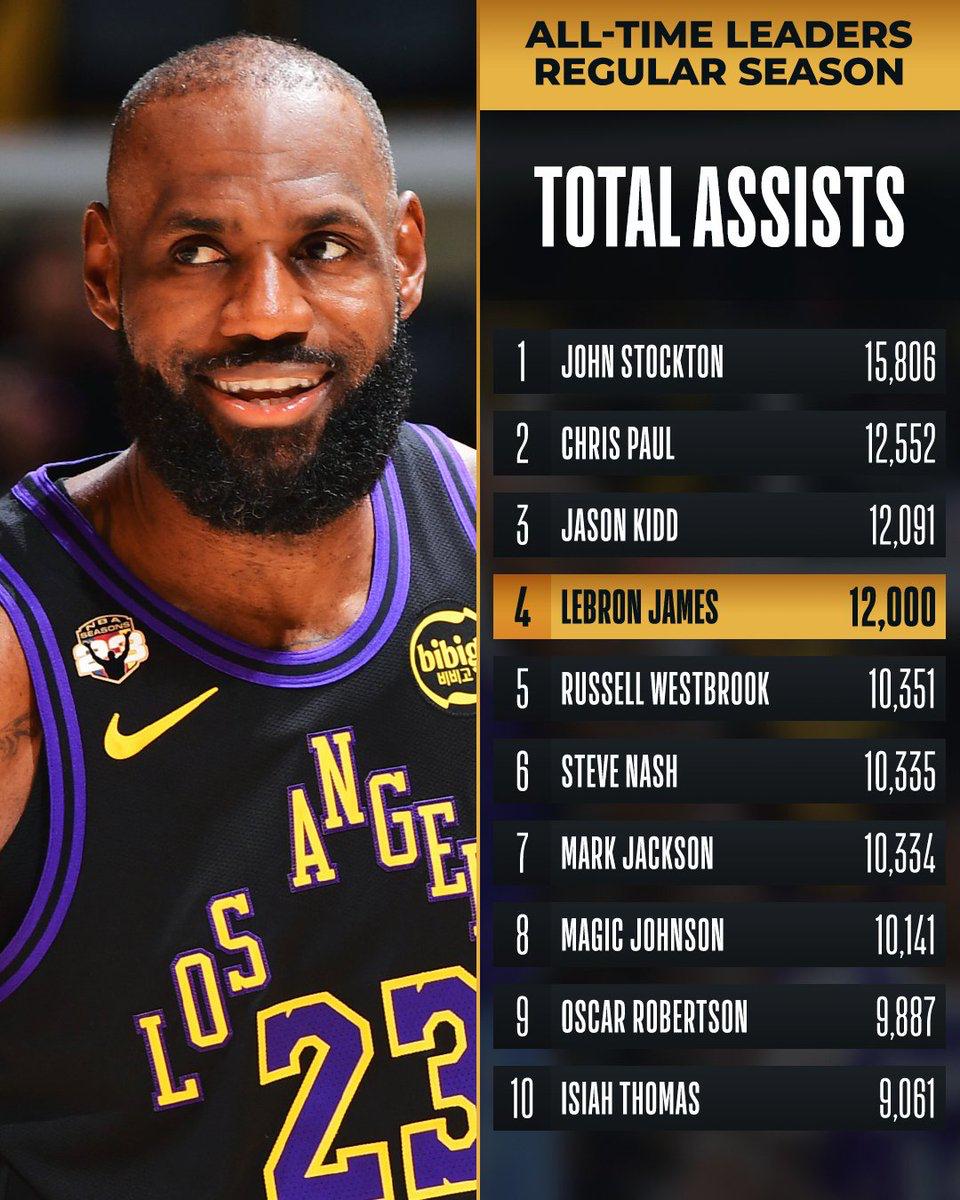 詹姆斯长传助攻艾顿得分,这是他本场第2次助攻,也是个人常规赛生涯第12000次助攻。他成为NBA史上第4位助攻数至少12000次的球员,历史前三依次为斯托克顿、保罗与基德。