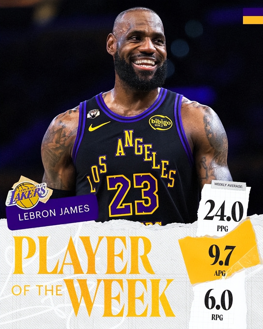 詹姆斯获选常规赛最后一周西部周最佳球员,他场均贡献24.0分、9.7次助攻和6.0个篮板,带领球队在缺少另外两位核心的情况下赢得比赛。