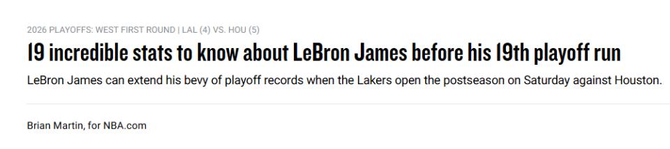 北京时间4月14日,洛杉矶湖人队将于本周日对阵休斯顿火箭队,拉开2026年NBA季后赛序幕,詹姆斯将迎来其职业生涯的第十九次季后赛之旅。为纪念这一历史性时刻,NBA官网展示了关于这位体育史上最伟大球员之一,你需要了解的十九项数据。