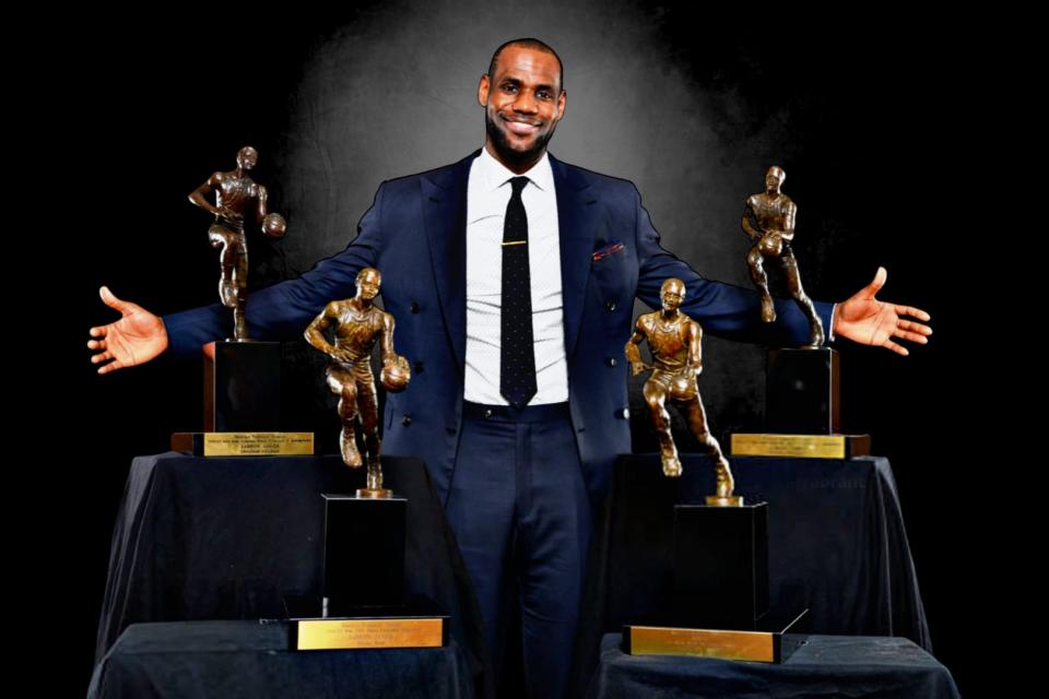 詹姆斯四次获得常规赛MVP,与威尔特-张伯伦并列历史第三,仅次于贾巴尔(六次)、乔丹与拉塞尔(各五次)。
