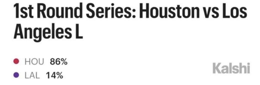 预测平台Kalshi今日更新了湖人火箭系列赛的晋级概率,火箭高达86%,湖人仅为14%。
