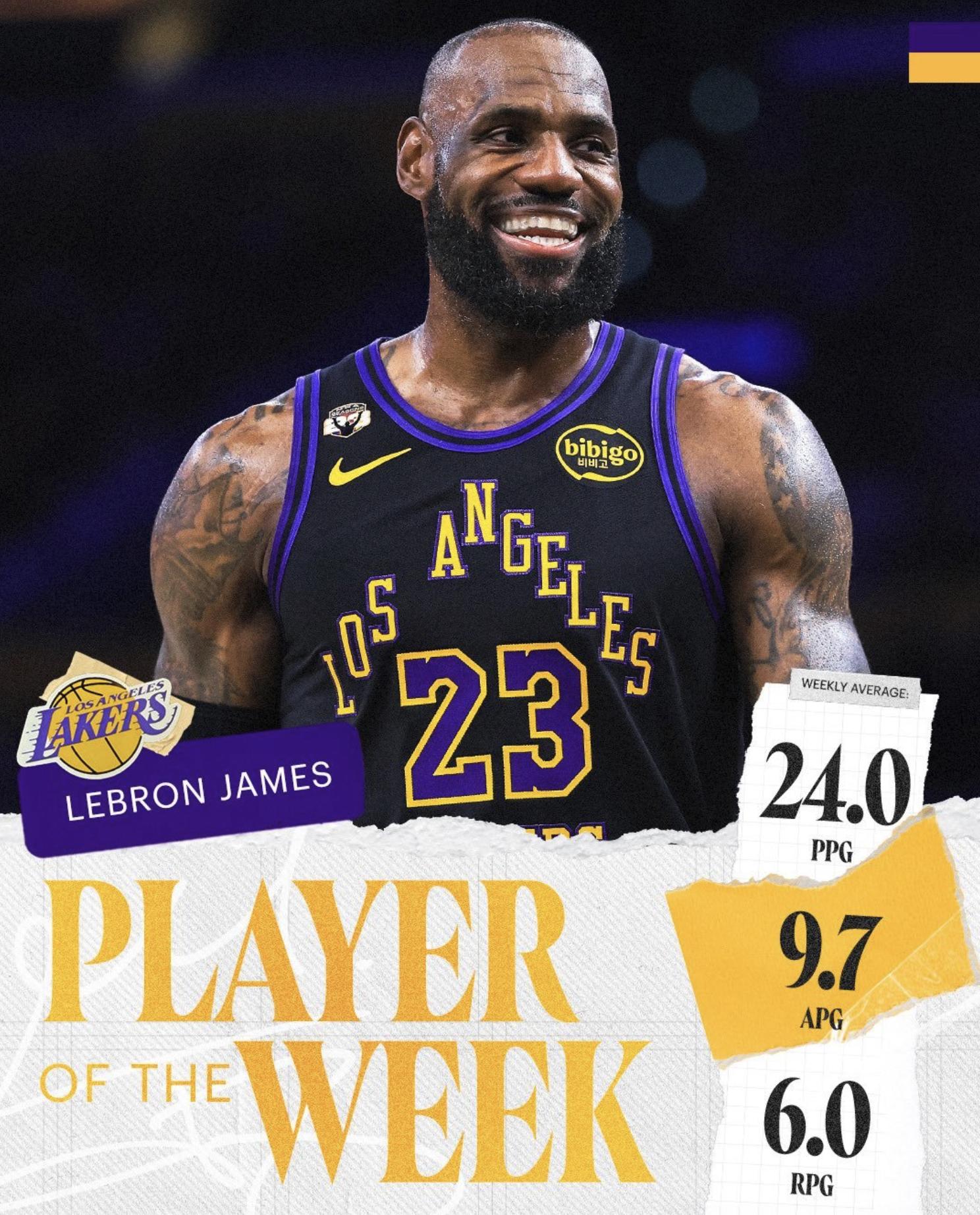 另外,今日NBA官方公布了常规赛第25周的周最佳球员,詹姆斯荣获西部周最佳。这是詹姆斯湖人生涯第9次、职业生涯第70次获得周最佳球员,继续位居历史第一。排名第二的是科比和杜兰特,各33次。