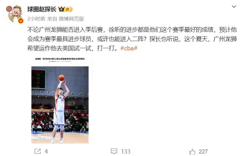 随后有媒体人士补充:广州队也正积极推动徐昕赴美尝试。广州队是目前CBA中与NBA合作最紧密的队伍,去年甚至参与了NBA季前赛。