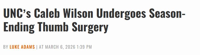北京时间3月7日,知名记者Shams透露,北卡大学一年级前锋凯勒布-威尔逊的新秀赛季已提前终结。他在周五训练中一次无对抗练习时右手拇指骨折,随后接受了手术。学校官方声明确认,此次受伤发生于一次扣篮动作中。