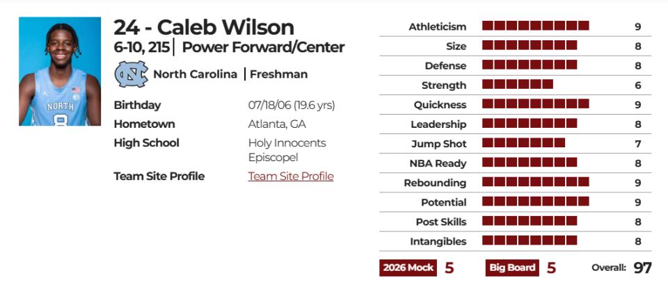 威尔逊本赛季在北卡表现突出,共出战24场,场均31.3分钟贡献19.8分、9.4篮板、2.7助攻、1.5抢断及1.4盖帽。这位身高2米08的前锋被选秀分析师广泛视为2026年NBA选秀前五顺位潜力人选,在各预测榜单上常仅次于达林-彼得森、AJ-迪班萨与卡梅伦-布泽尔。其选秀参照对象为小奥尼尔和波什。优势在于运动能力、速度与篮板,而力量与跳投仍需加强。